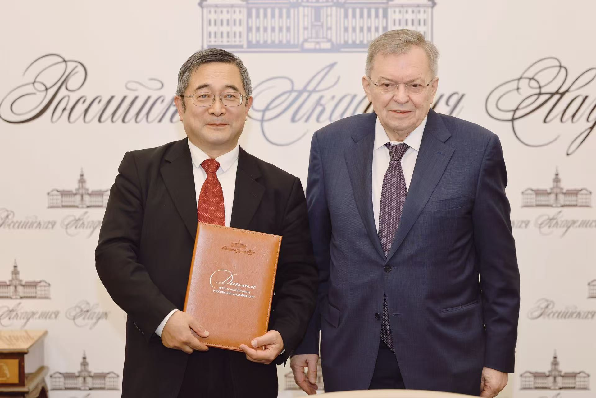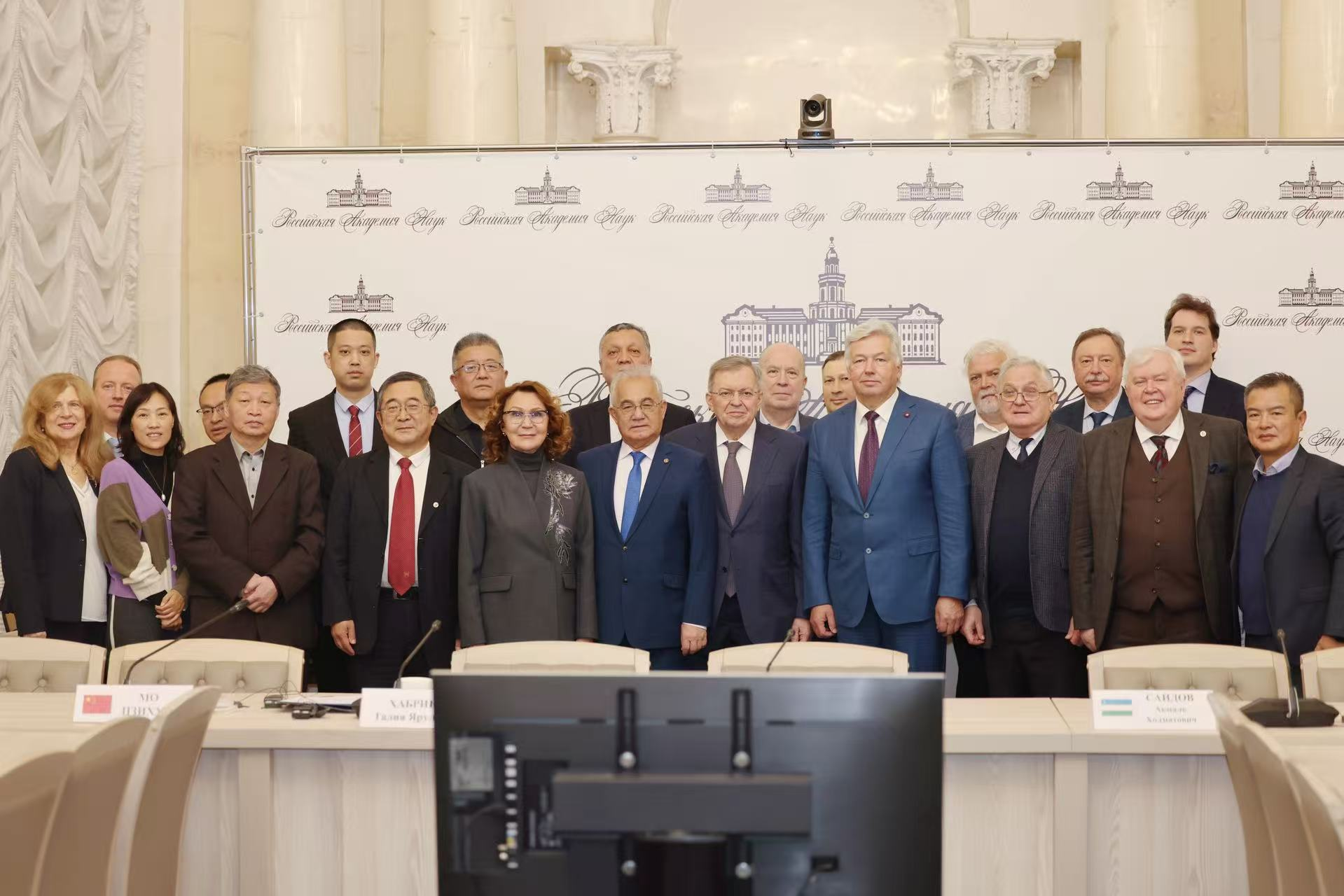 2025年11月21日上午,俄罗斯科学院举行隆重仪式,授予中国社会科学院学部委员、法学研究所所长莫纪宏研究员外籍院士,并颁发院士证书及荣誉徽章。仪式结束后,俄罗斯科学院副院长弗拉迪斯拉夫·潘琴科院士,俄罗斯科学院副院长、社科学部学术秘书哈布里耶娃·塔莉娅·雅卢洛夫娜院士以及出席仪式的其他俄罗斯科学院院士与莫纪宏学部委员和法学所、国际法所出访团成员合影留念。