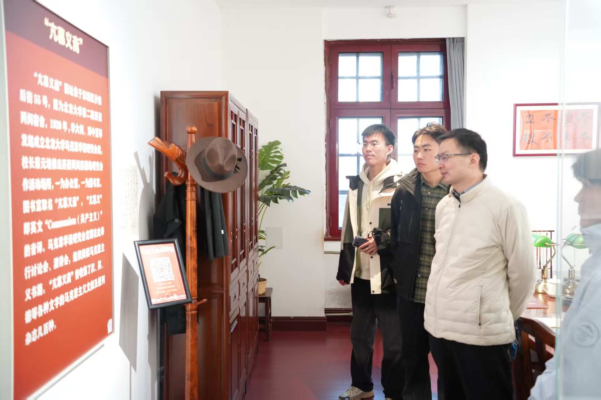 当法学院新生们怀着崇敬之心踏入北大红楼的朱漆门廊,走进新文化运动主阵地和中国共产党早期旧址,这座百年建筑承载着的中国近代思想启蒙的整容记忆扑面而来。展馆中陈列的泛黄的《新青年》杂志、李大钊手稿复制品、“五四运动”历史照片等文物,将同学们瞬间带回“觉醒年代”。站在这里,同学们深刻体会到了“真理的味道非常甜”的信仰力量,也仿佛听见了百年前进步青年为法治理想呐喊的声音,产生了对新时代法治建设的新的思考。法学所副研究员、法学院本科生部副主任焦旭鹏老师迎接同学们并陪同参观。