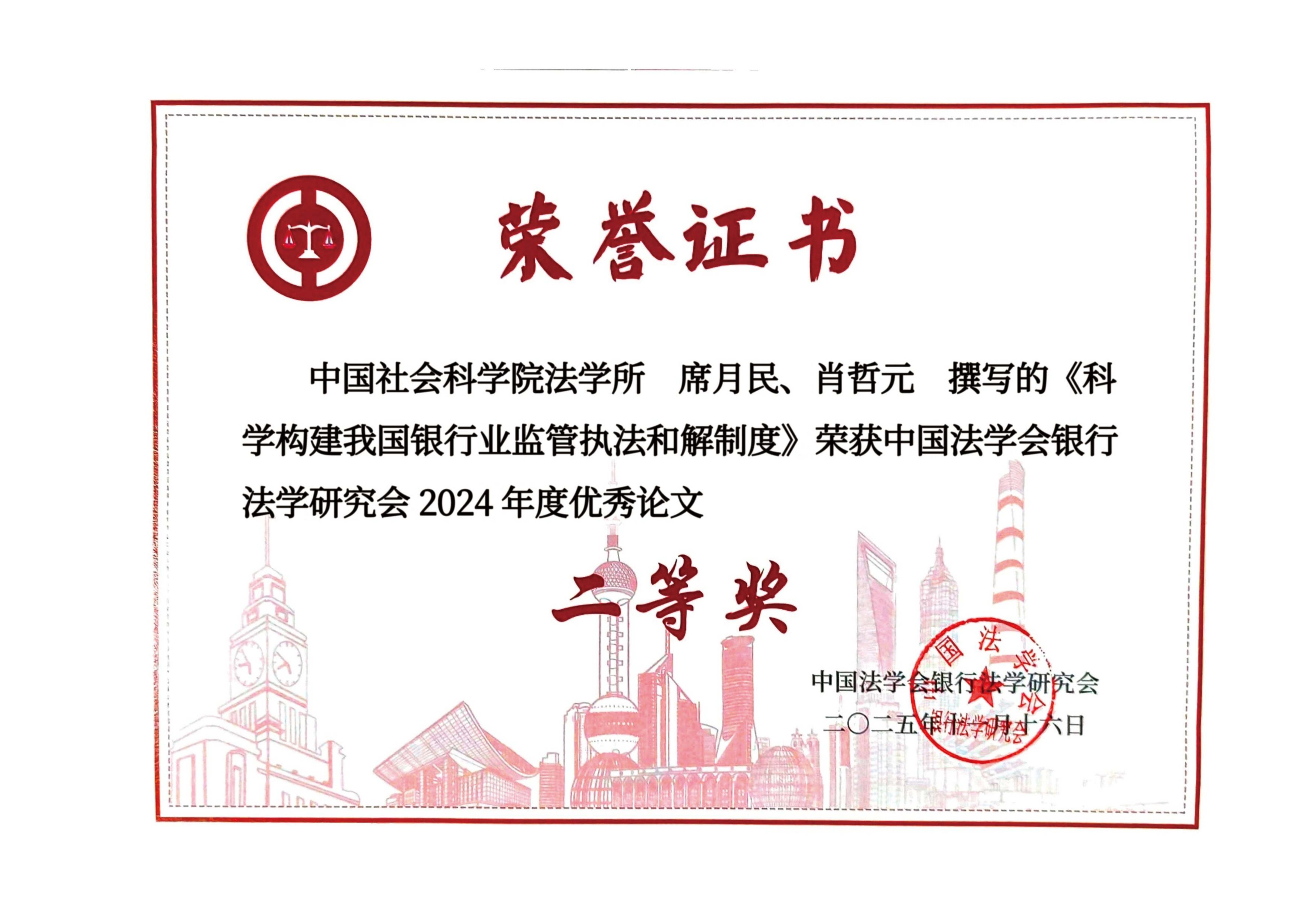 席月民、肖哲元荣获中国法学会银行法学研究会年会论文二等奖