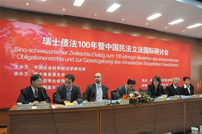 2012年10月27日,“瑞士债法百年暨中国民法典立法问题国际研讨会”在中国社会科学院法学研究所举行。此次研讨会由法学研究所主办、瑞士驻华大使馆、瑞士国家形象委员会、瑞士弗里堡大学协办。来自瑞士弗里堡大学、伯尔尼大学、德国康斯坦茨大学等30余名外方专家以及清华大学、北京大学、中国人民大学、中国政法大学、西南政法大学、华东政法大学、对外经济贸易大学、法学研究所等70余名专家学者参加了此次会议。瑞士驻华使馆参赞Nektarios Palaskas先生、教育主管Conradin Pfaff先生、弗里堡大学副校长Rumo-Jungo教授以及法学研究所、国际法研究所联合党委陈甦书记出席会议。
