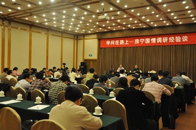 活动分两个部分。首先,为了引导青年科研人员进一步走进基层、参与实践、了解国情,增强青年理论工作者理论联系实际的能力,在陈甦书记的主持下,政治学所所长房宁研究员以“学问在路上”为主题,作了有关国情调研经验交流的报告。房宁所长旁征博引、深入浅出,总结了做好国情调研的三大要点:一是把观念的世界转换为经验的世界;二是现场找感觉,案头出文章;三是要有正确的调研方法,即找对人、注重细节、保持客观性、注意比较、建立基地。陈甦书记认为做好学问,做好调研,首要的就是洞察世事人情,同时还应做到四个“在”,即在路上、在现场、在思考和在自塑。整个报告会妙趣横生,发人深省,与会青年深受启发。