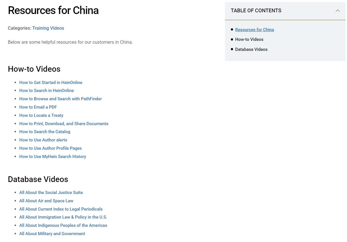 您可访问https://help.heinonline.org/kb/resources-for-china/,获取全套官方视频使用指南,该系列视频分类清晰、覆盖全面,可系统指导大家高效掌握heinonline数据库的使用方法。