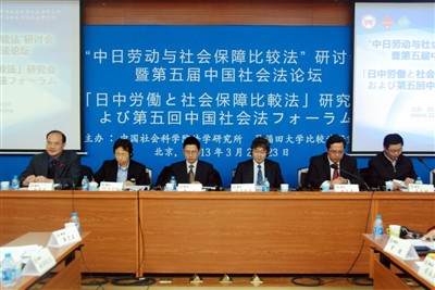 2013年3月22-23日,中国社会科学院法学研究所举办"中日劳动与社会保障比较法"研讨会暨第五届中国社会法论坛。本次研讨会是法学所与早稻田大学长期合作项目的阶段性学术活动。会议主要就"非典型用工的劳动法和社会保障法问题、性别视角下的劳动和社会保障法、养老保险和医疗保险法律问题、政府在社会保障中的义务和责任"四项议题展开讨论。