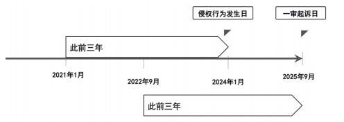 作为确定商标权人不使用时间的起算点,法条中规定的“此前”具有特别重要的意义。以该起算点为基础向前推三年,如果商标权人在这一期限内没有实际使用商标的话,则被控侵权人并不承担损害赔偿之责任。司法实践中,对于起算点存在不同的判断标准(如图2所示)。有案例认为应以侵权行为发生日为起算点,也有案例认为应以一审起诉日或请求赔偿日为起算点。